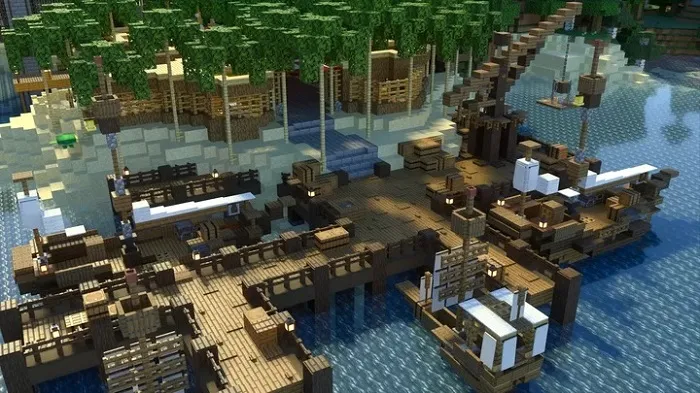 Map Lakewell Kingdom is a huge medieval kingdom for Minecraft PE, on the territory of which many interesting and beautiful places were created — a castle on top of a mountain, a market and a port, a village and much more.