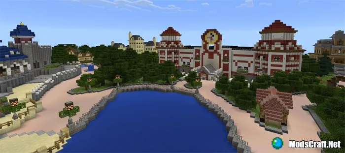 On the map DisneyPark You will find a huge stunning park that is created in the style of Disneyland for Minecraft Pocket Edition. In the park you will find many attractions, such as roller coasters and even a fabulous Cinderella Castle.
