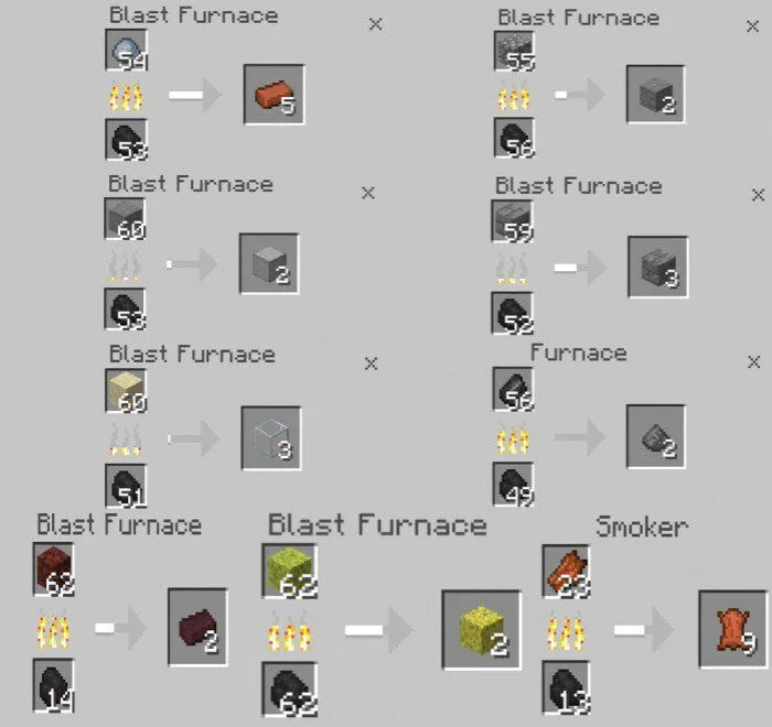 In the picture below you will find several recipes for crafting in the Oven, Melting Furnace, Smokehouse and Bonfire: