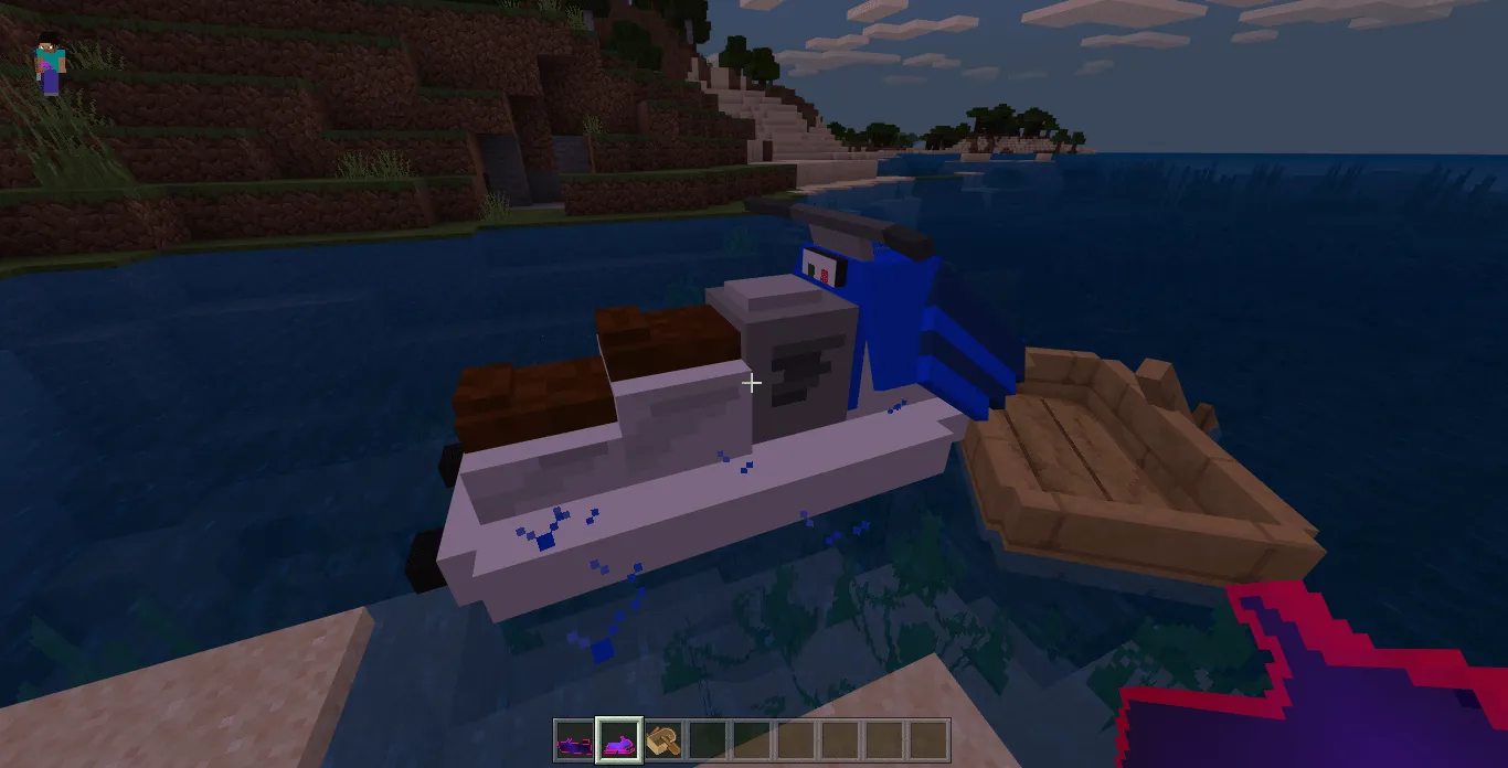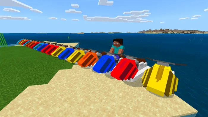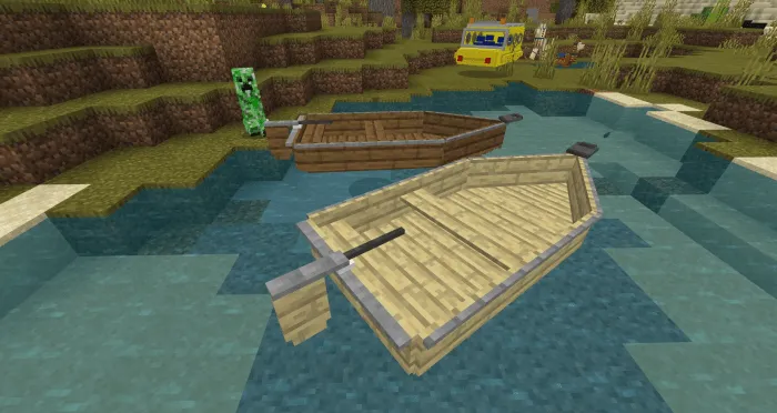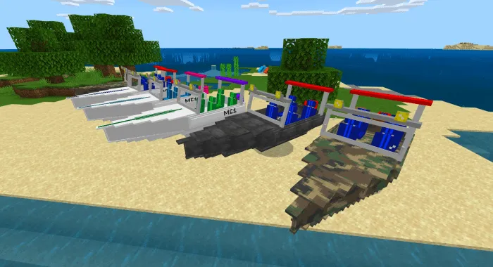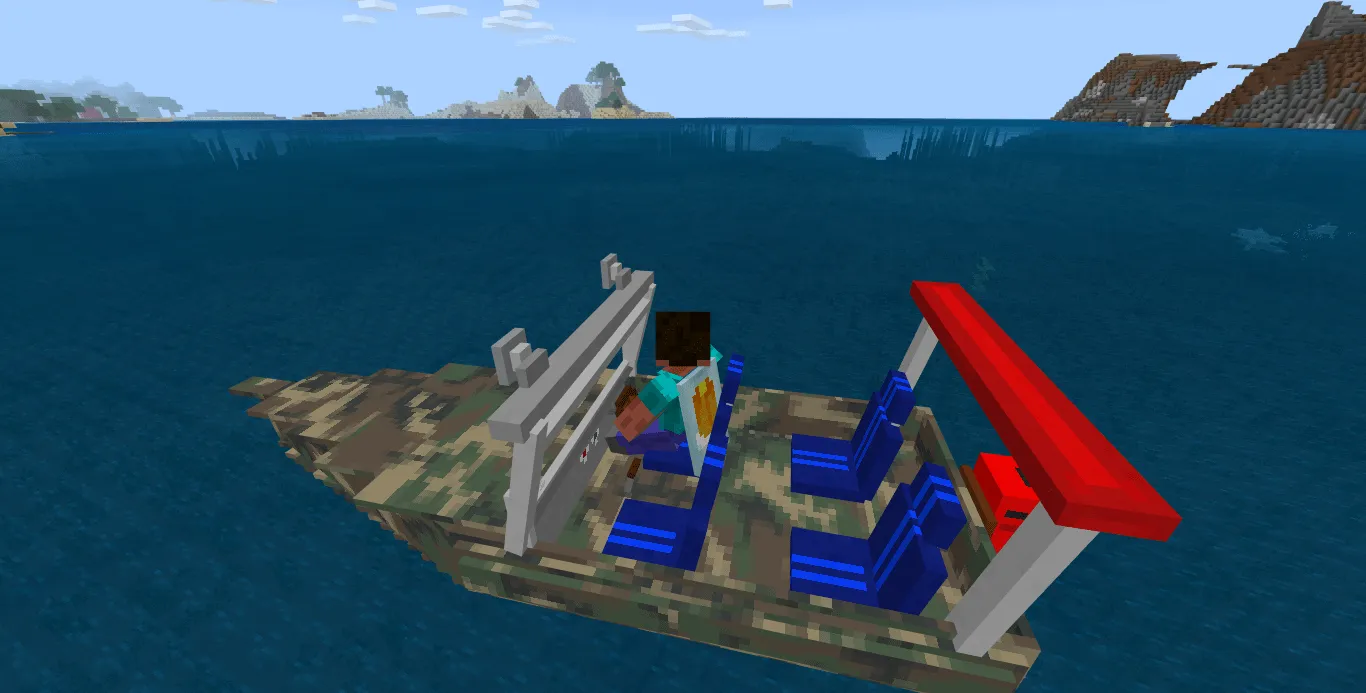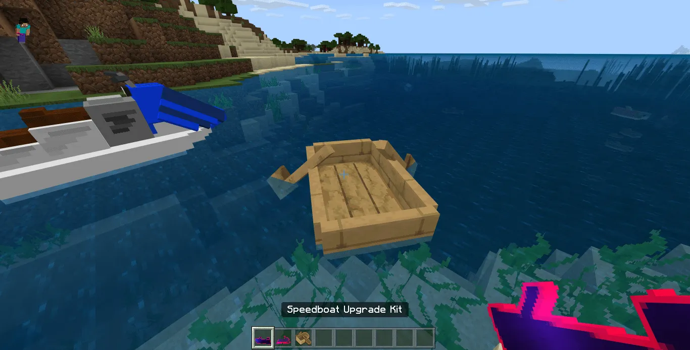 To get any of these motorboats, you need to create an appropriate upgrade kit and interact with a regular Minecraft boat by holding it. She will magically transform into an amazing motor beast.