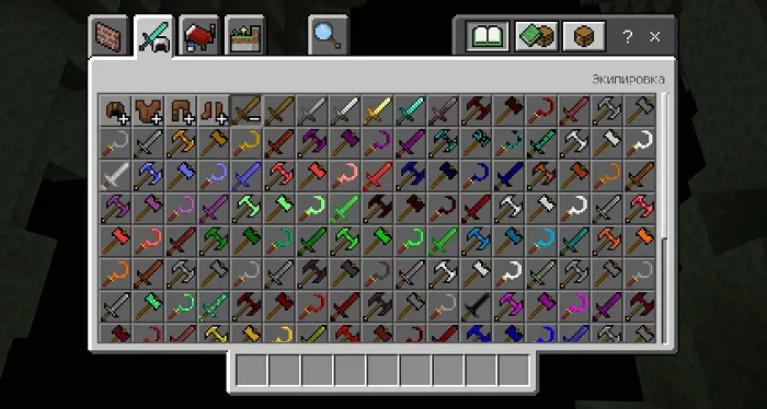 Like the rest of the tools and armor, new weapons can be found in the inventory of the creative mode. Battle axes, swords, hammers and sickles can be obtained from the swords menu. All crafting recipes can be found on the workbench and ingots from new ores are used.