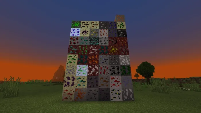 Below you can see a screenshot with all the ores in this mod, in the Ordinary world 30 ores are generated, 10 ores in the Cave and 10 ores in the End. All of them will be used in the next few updates, and at the moment they are used to create weapons, some of them for picks.