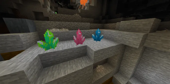 Stone plants in a cave? It's about crystals! They randomly appear in caves and illuminate these dark depths. They serve one purpose - to provide light. The blue crystal was made 2d to look like the future version 1.17. As mentioned earlier, this addition is not a concept 1.17.