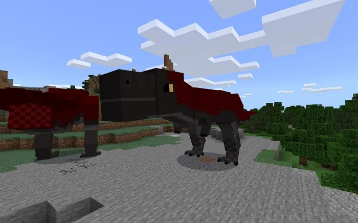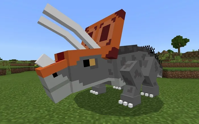 After taming, triceratops becomes faster and can destroy blocks like wood, as well as attack mobs. You can also use a harvest staff to let them harvest foliage, saplings, and wood.
