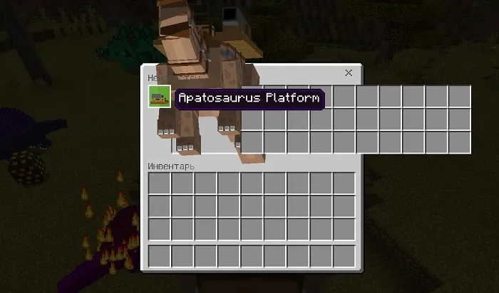 After taming the apatosaurus, you need to put a special saddle (apatosaurus platform) in his inventory, which allows you to control dinosaurs and shoot guns.