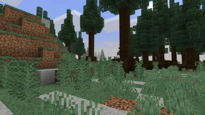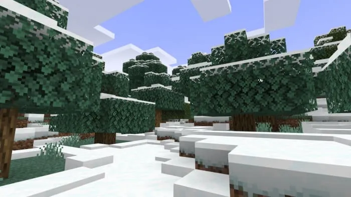Here you can find large dense coniferous trees and spruce bushes. If you do not have enough spruce wood, then you will definitely like the place. The cold northern forest is different in that it is covered with snow.