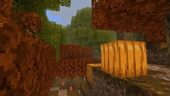 Biomes were inspired by the Halloween holiday. It is a dense forest with yellow and orange foliage on the trees. Pumpkins can be found in large numbers, and a lot of cobwebs and mushrooms are also generated here. You will be able to meet bats, and witches will appear often. The biome itself is surrounded by thick fog, which adds even more gloom.