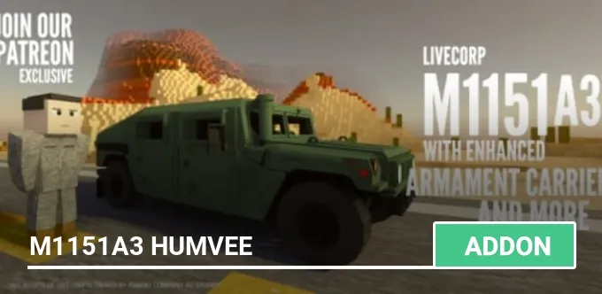 M1151a3 Humvee addon adds an all-time favorite military vehicle to Minecraft. It's an A2 variant with more cargo space, no turret, color olive gray.