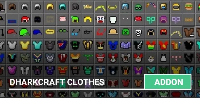 The Dharkcraft Clothes mod will add hundreds of new items of clothing to Minecraft PE, which you can get in creative mode or create using a workbench and a stonecutter!