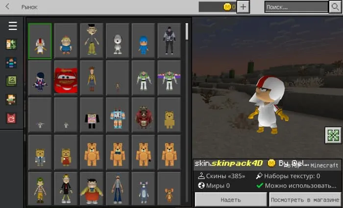 - Откройте Minecraft PE, перейдите в «Рынок → Скины», найдите набор «Первая годовщина» и примените нужный 3D/4D‑скин.