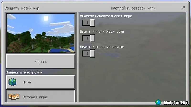 Теперь, игрок, который раздал Wi-Fi или который хочет запустить свой мир, должен перейти в окно создания мира MCPE или его редактирования, и во вкладке Сетевая игра необходимо активировать опции Многопользовательская игра и Видят локальные игроки.