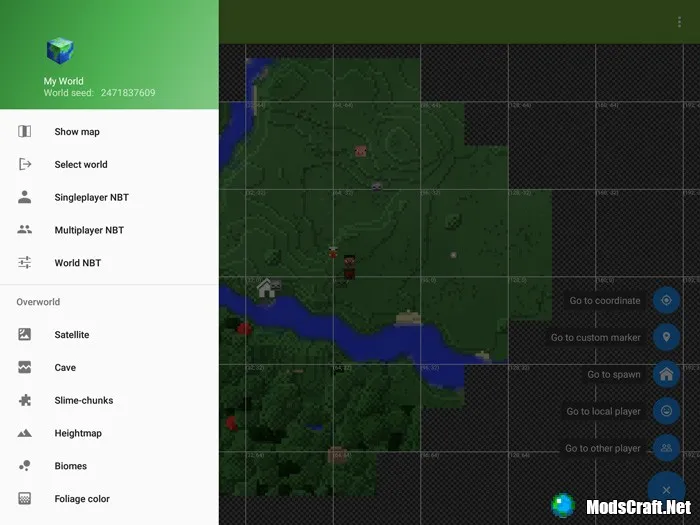 Откроется окно, в котором Вы увидите карту своего мира. Это действительно круто и это еще одна причина установить данное приложение. Нажмите на значок «+» в нижнем правом углу, а затем выберите Singleplayer NBT в меню слева.
