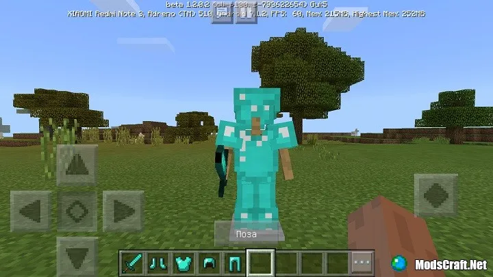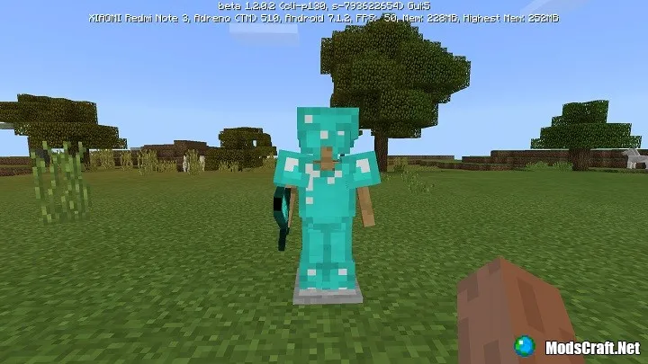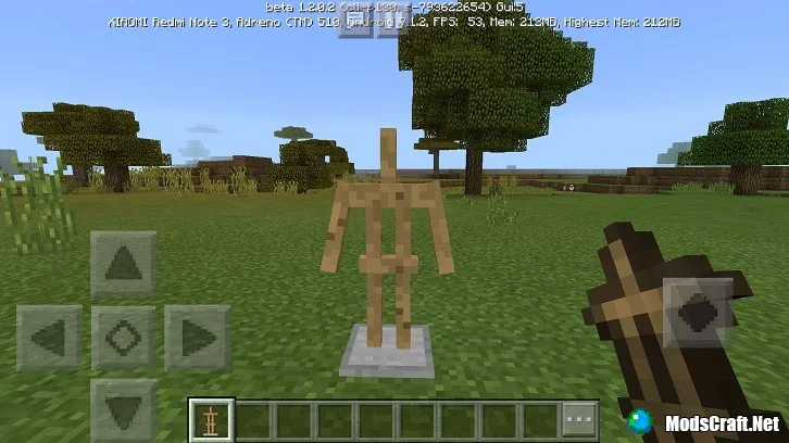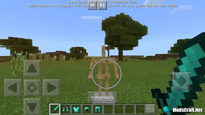 В руку, а также на голову, ноги и тело можно поместить любой предмет или блок, а также броню. Для этого Вам нужно лишь взять какой-то предмет или броню, навести им на стойку и нажать на кнопку Экипировать. Вы также можете просто долго удерживать пальцем по стойке, чтобы дать ей предмет.