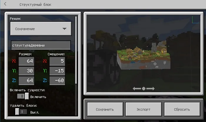 Интерфейс структурного блока в Майнкрафт Бедрок