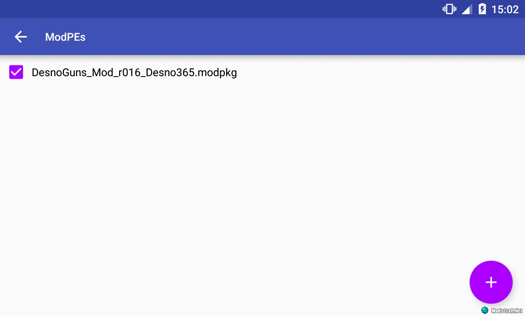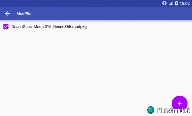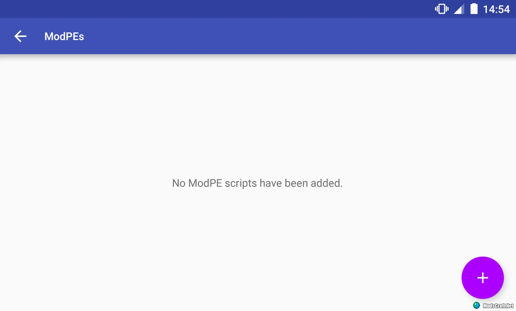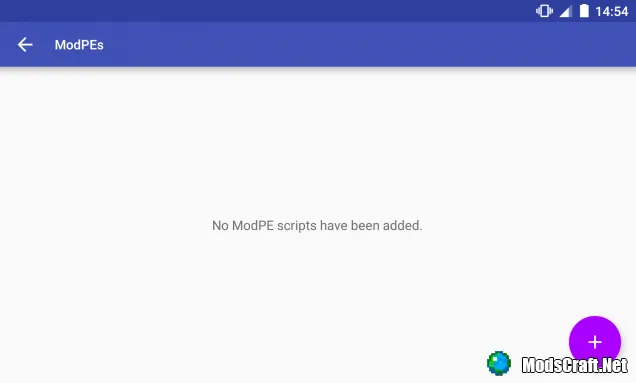 Нас интересует пункт ModPEs. Нажмите на эту кнопку и у вас откроется окно менеджера скриптов. Здесь вы сможете управлять скриптами. Для добавления мода нужно нажать на кнопку +.