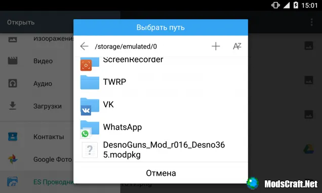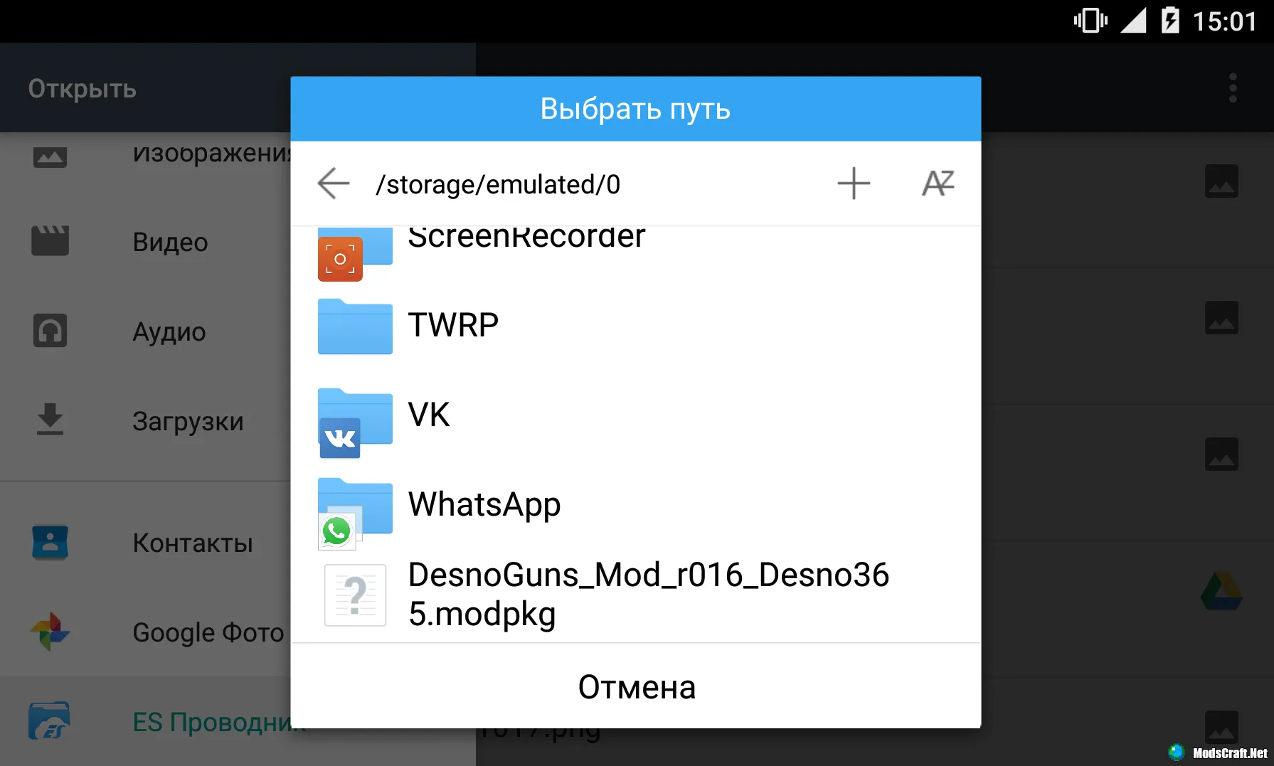 С помощью ES проводника или другого менджера файлов находим файл мода. Файлы модов могут быть в форматах: .js или .modpkg. В моём случае это .modpkg.