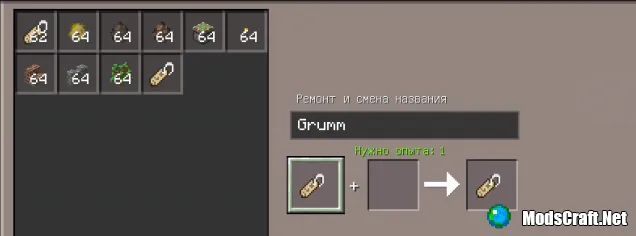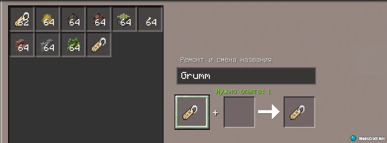 Тапните по наковальне, чтобы открыть её интерфейс. Положите в первый слот саму бирку и переименуйте её в Dinnerbone или Grumm. Я решил переименовать в Grumm.
