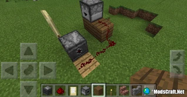 Далее подключаем к другой стороне наблюдателя с круглым отверстием редстоун пыль и напротив двери размещаем раздатчик, как на скриншоте ниже.