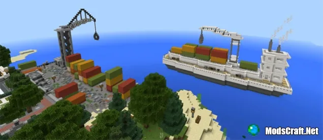 На верфи вы найдёте грузовые контейнеры, а также грузовой корабль, который стоит на якоре.