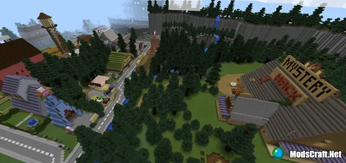 Это карта воссоздаст в Minecraft Pocket Edition вымышленный городок Гравити Фолз в штате Орегон. Если вы являетесь поклонником такого сериала, то карта определенно вам понравится!