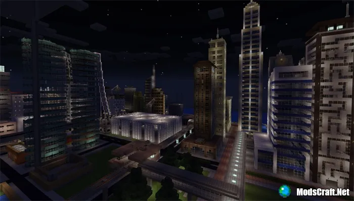 Карта Megacity представляет из себя действительно очень интересный город для Minecraft Pocket Edition, который вы можете исследовать. Он особенно красив ночью, поскольку большинство зданий имеют фонари, что делает их более заметными в ночное время.