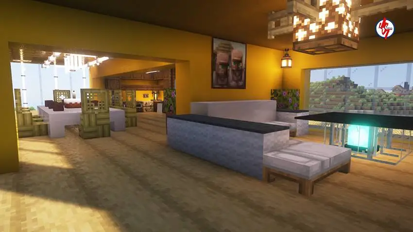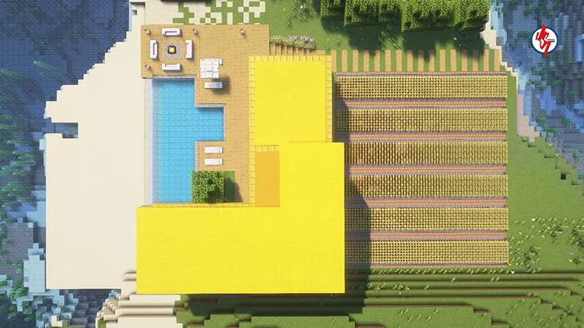 На карте Survival Modern House #90 создан уютный дом для выживания, который построен на острове и оформлен в золотой тематике. Дом полностью готов к игре в режиме выживания и вписан в окружающий биом островного выживания, что создаёт атмосферу отдельного убежища среди воды.