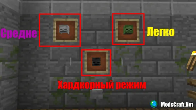 Когда вы решите, что вы готовы, то подойдите к рамкам с кнопками и выберите сложность. Нажмите на одну из трёх кнопок, чтобы выбрать сложность игры.