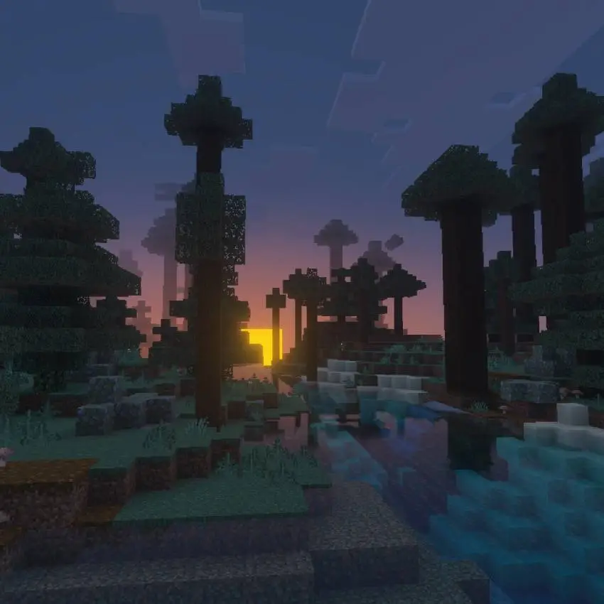 Карта Forest World состоит из бескрайнего соснового леса, где густые деревья и тёмные тени создают атмосферу для выживания и исследований. В игре включены достижения, координаты, полностью доступен Портал в Край, что подходит для длительного исследования.