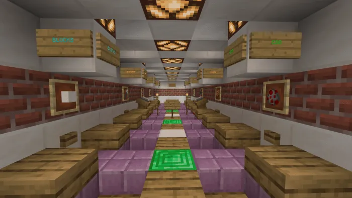 Вы можете зайти внутрь и купить что-нибудь полезное! В магазине создано 8 различных категорий: оружие, еда, яйца, блоки, руды, саженцы и многое другое.