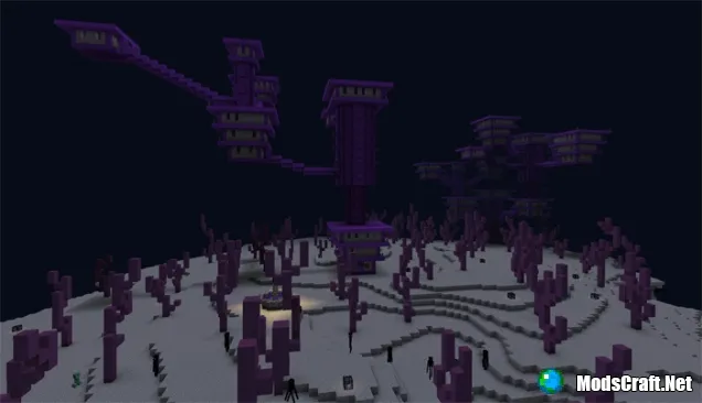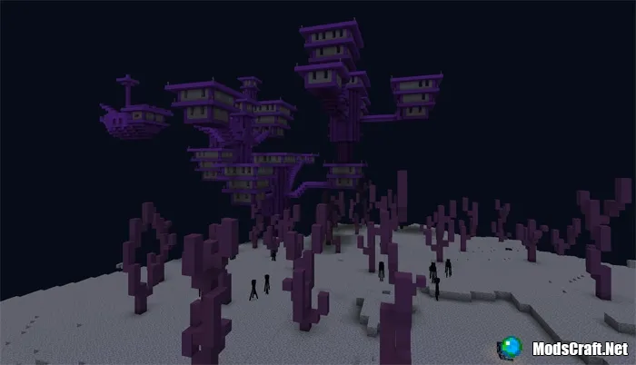 В данном случае Край состоит из одного большого острова с одним городом, который выглядит, как огромные фиолетовые деревья. Вокруг острова есть множество ендерменов, которые будут для вас являться дружелюбными, пока вы не посмотрите им в глаза.