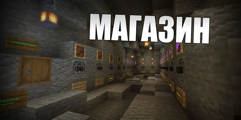 В магазине вы сможете продать свои ресурсы, а также купить книги зачарования, кирки, эффекты (скорость, спешка, супер прыжок) и эффект «АВТО ПЛАВКА» (автоматическая переплавка металлов).