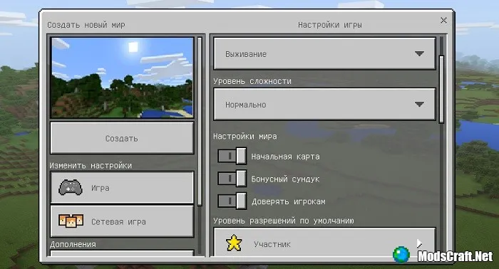 - При создании мира теперь можно активировать начальную карту и бонусный сундук, настроить уровень разрешения игроков и игровые правила.