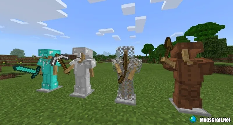 Одним из самых долгожданным нововведений в Minecraft 1.2 на Android, IOS и Windows 10 является стойка для брони! Вы сможете надеть на нее броню и положить в руку меч или любой другой инструмент.