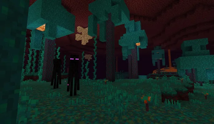 Багровый лес, как и Искажённый лес состоит из земляных блоков и деревьев, но они имеют отличия. В Багровом лесу можно найти Пиглинов и Хоглинов.