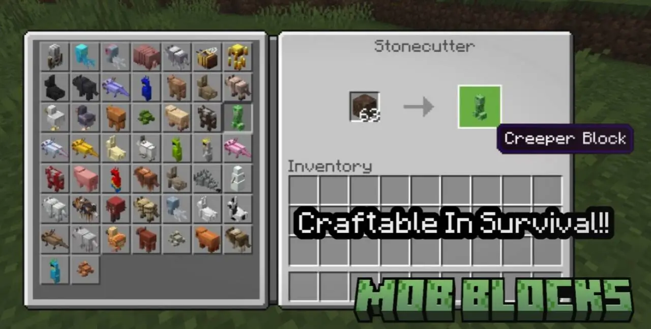 Мод Mob Entity Blocks позволяет создать блоки с лицами всех существ Minecraft, от дружелюбных волков до трудолюбивых пчёл! Всего доступно 51 вариант, каждый блок создаётся из песка душ.
