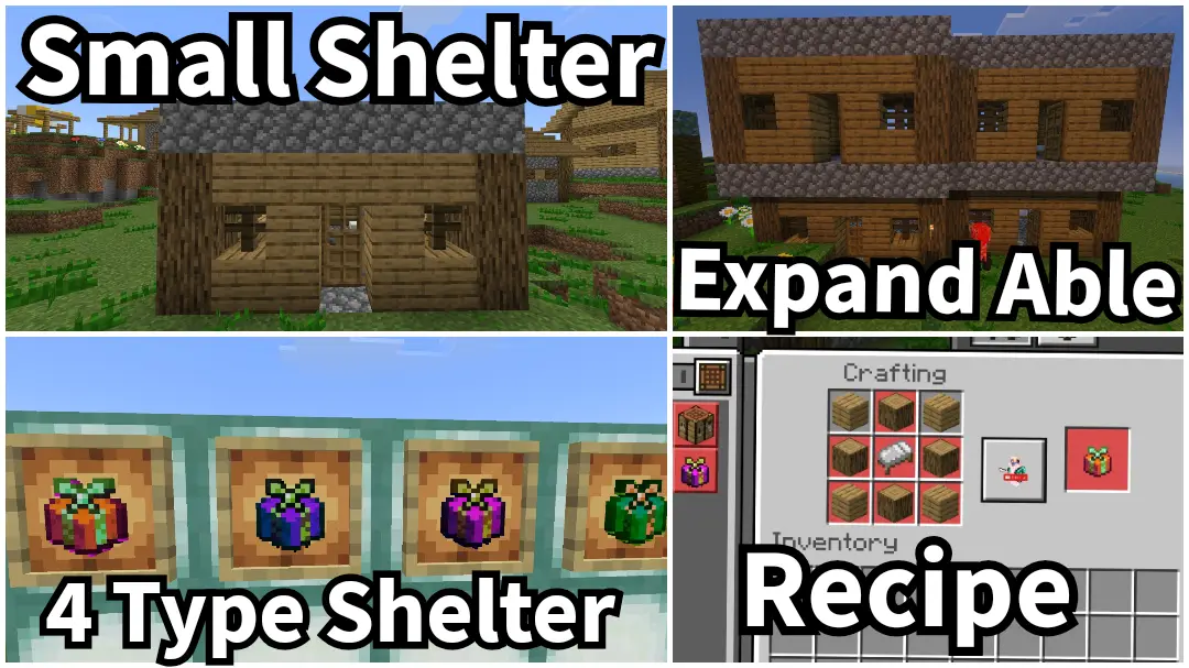 Мод More Shelter добавляет 4 типа небольших укрытий, каждый из которых идеально подходит под определённый биом. Эти убежища можно быстро развернуть одним кликом правой кнопки мыши или касанием и вы сразу получаете защищённое место для отдыха и хранения.