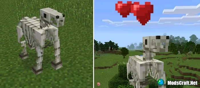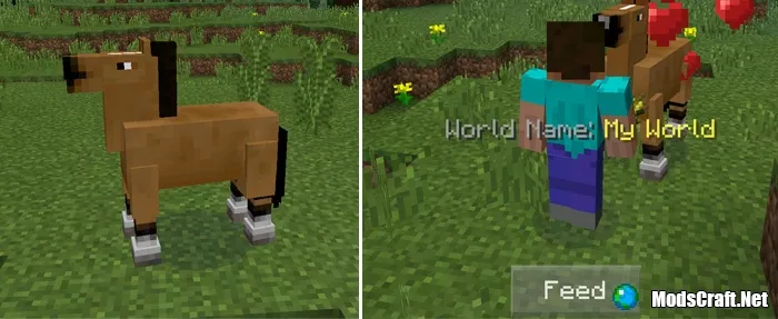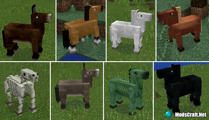 Мод Horses добавит в игру 10 видов лошадей, которые отличаются текстурами и окрасом. Лошади могут быть приручены и использованы для верховой езды. Они будут появляться в мире случайным образом, но вы также можете создавать их с помощью специального яйца порождения, которое можно найти в инвентаре творческого режима.