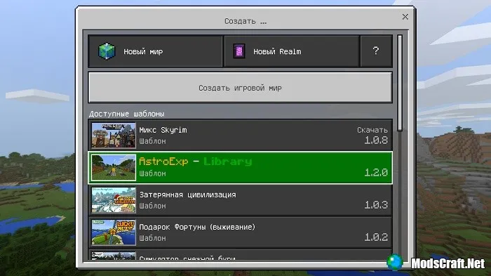 Аддон «Astronomic Expansion» включает в себя специальный мир, в котором Вы сможете быстро получить доступ ко всем предметам и блокам! Вы можете создать эту карту выбрав шаблон при создании мира.