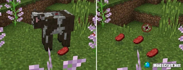 Прикрепляемую мясорубку можно прикрепить к животному или монстру, а затем моб умрёт и вы получите дроп. Например, с коровы, в лучшем случае вам может выпасть одна говядина или более.