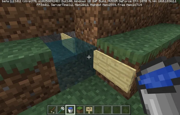Если вы хотите проползать через отверстия высотой в один блок, то установите табличку и разместите воду, как показано на скриншоте ниже.