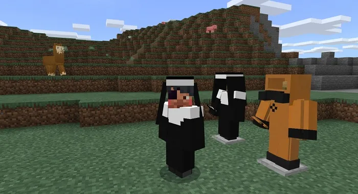 Используйте команду '/give @s we:hazmat_suit' для получения защитного костюма и '/give @s we:nun_clothe' для получения костюма монашки.