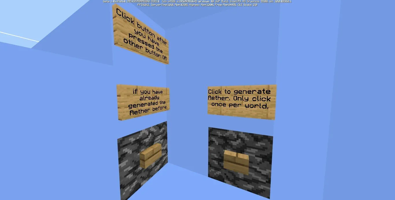 Сперва нажмите на ту кнопку, где одна табличка, таким образом начнется генерация Эфира. На генерацию нового измерения уйдет примерно 30 секунд-1 минуту. Эту кнопку нужно нажать только 1 раз в вашем мире.