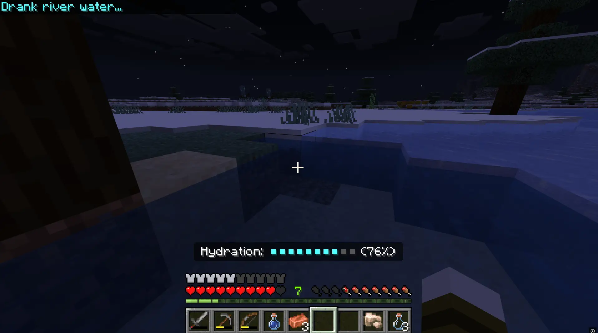 Мод Hydration Logic добавляет реалистичную систему жажды в игру. Над меню быстрого доступа отображается индикатор воды, который постепенно снижается при беге и в Незере. При полном обезвоживании персонаж получает негативные эффекты и урон.