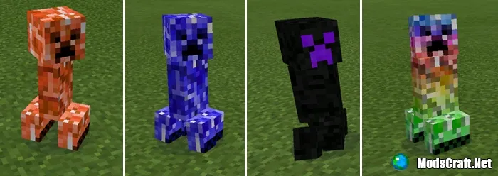 В мире вы можете найти новых существ, которые будут спауниться рандомно. Мод добавит различных криперов, которые выглядят совершенно по-разному и имеют разный эффект взрыва. Например, оранжевый крипер при взрыве будет дропать морковь, а синий создаст небольшое озеро из воды.