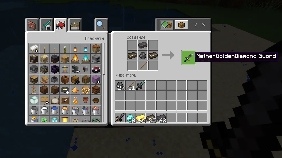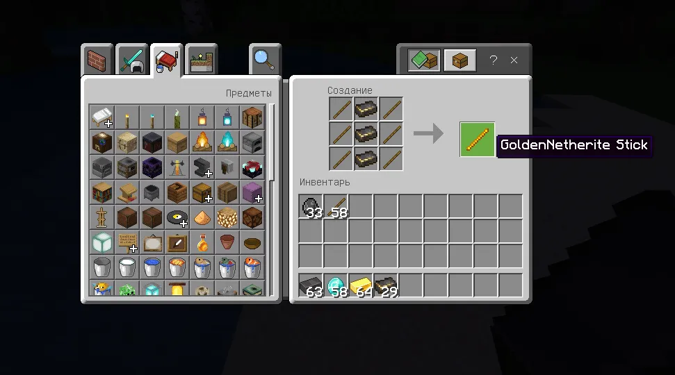 С помощью данного материала вы сможете создать новую палку (Незеритовая Золотая палка), а так же 2 меча (Незеритовый Золотой меч и Незеритовый Алмазно-золотой меч).