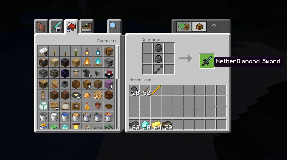 С помощью этого материала вы сможете создать новую палку (Незеритовая Алмазная палка), а так же 2 меча (Незеритовый Алмазный меч и Незеритовый Алмазно-золотой меч).