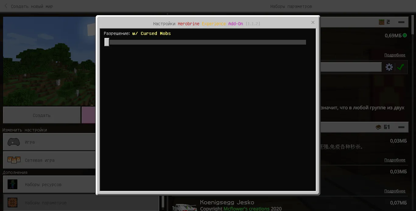 Если вы хотите, чтобы в вашем мире появлялись проклятые животные, в наборах параметрах выберите мод Herobrine Experience и нажмите на значок шестеренки и передвиньте ползунок в левую часть.