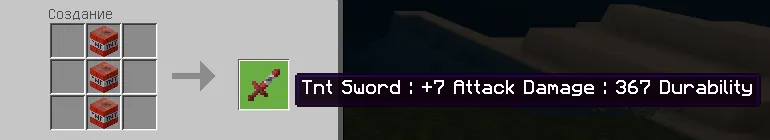 - Примечание: если вы создаете этот меч с клинком дракона (2 драконьих яйца, 1 tnt), способность будет намного сильнее. Создает несколько tnt и мгновенно взрывается, создавая эффект рассеянной бомбы. Опять же, одноразовый.: