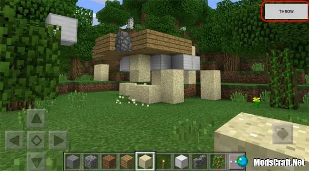 Убедитесь в том, что нужный вам блок находится в активном слоте хотбара, в этом случае вы увидите кнопку THROW. Направьте взгляд в игре в то направление, в которое хотите разместите блок, а после нажмите на кнопку THROW.