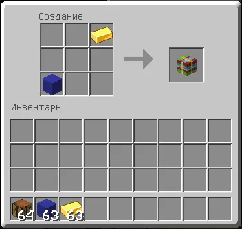 Подарочную коробку можно создать из любого блока шерсти + золотой слиток. После крафта в инвентаре появится блок, который нужно разместить и сломать. Так вы получите все 4 вида подарочной коробки (1х Красный, 1х Синий, 1х Зеленый, 1х Фиолетовый). Рецепт крафта: